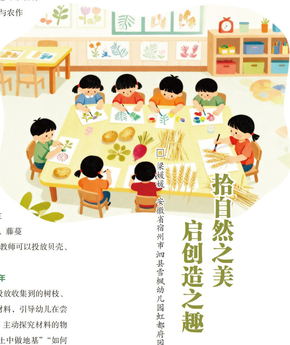 我国著名教育家陈鹤琴先生提出:“大自然、大社会都是活教材。”自然材料作为大自然馈赠幼儿的天然学具,以其多样的形状、丰富的质感与多变的形态,为幼儿教育提供了无限可能。 幼儿、教师与家长应共同参与到自然材料的收集中,一起打造充满探索精神的自然材料宝库。 园内采集。教师可带领幼儿在园内寻找并收集常见的自然材料,如不同种类的落叶(玉兰树叶、乌柏树叶、银杏树叶、竹叶等)、小木桩、段状枯枝、松果及掉落的花