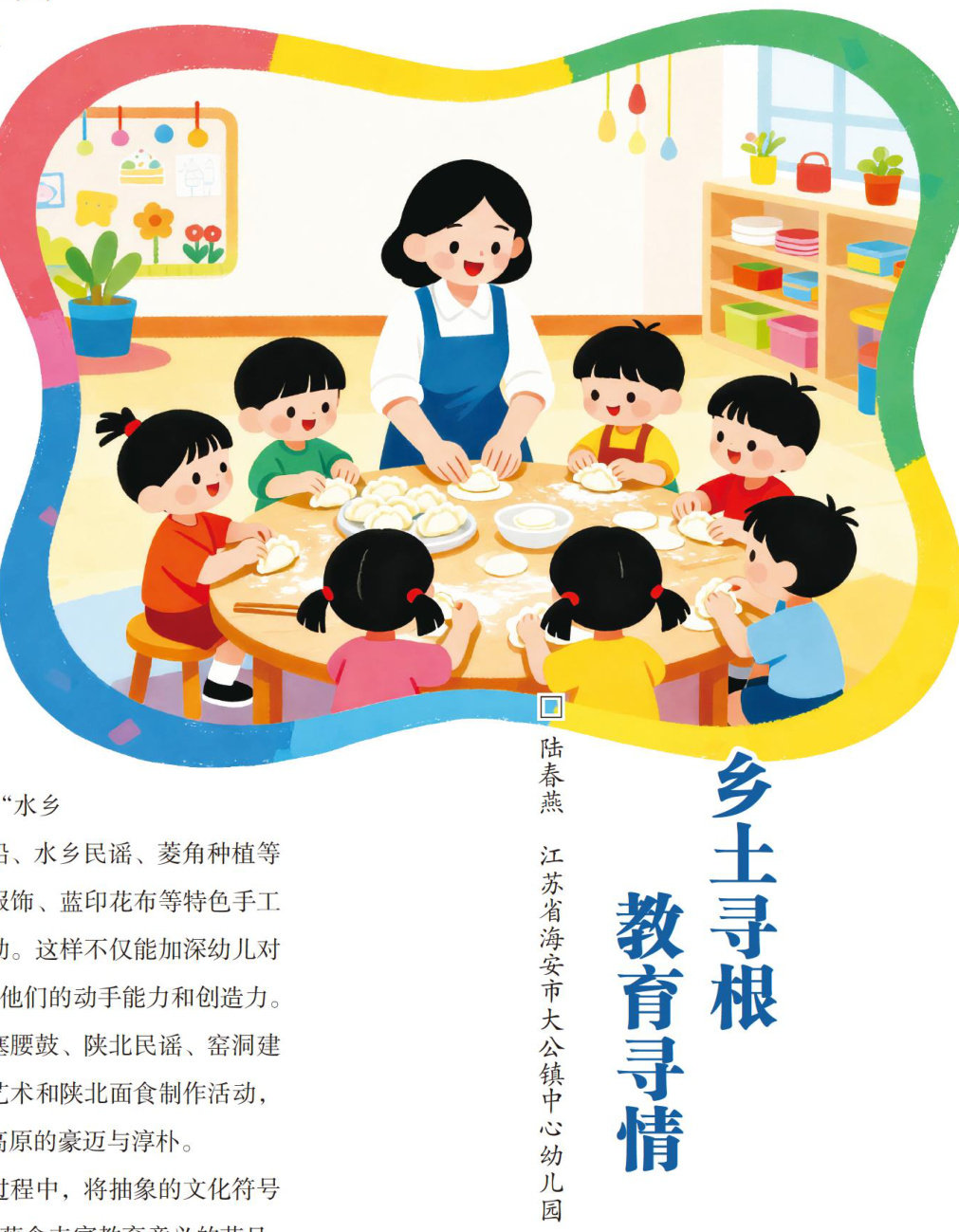 乡土文化是基于区域历史演变过程中的文化产物,包括风俗、技艺、民间故事等,对幼儿深人了解家乡文化、增强家乡归属感具有深远意义。幼儿园作为重要的文化传承场所,应立足于园所的实际情况,创新性地将乡土文化融入课程内容,丰富其表现形式,并激发幼儿的文化自信与乡土情怀。我园“童乡忆韵”课程的设想便从园所自身实际出发,以幼儿的视野来审视乡土文化,并通过将乡土文化游戏化、生活化、体验化的方式,转变灌输式的单向传递