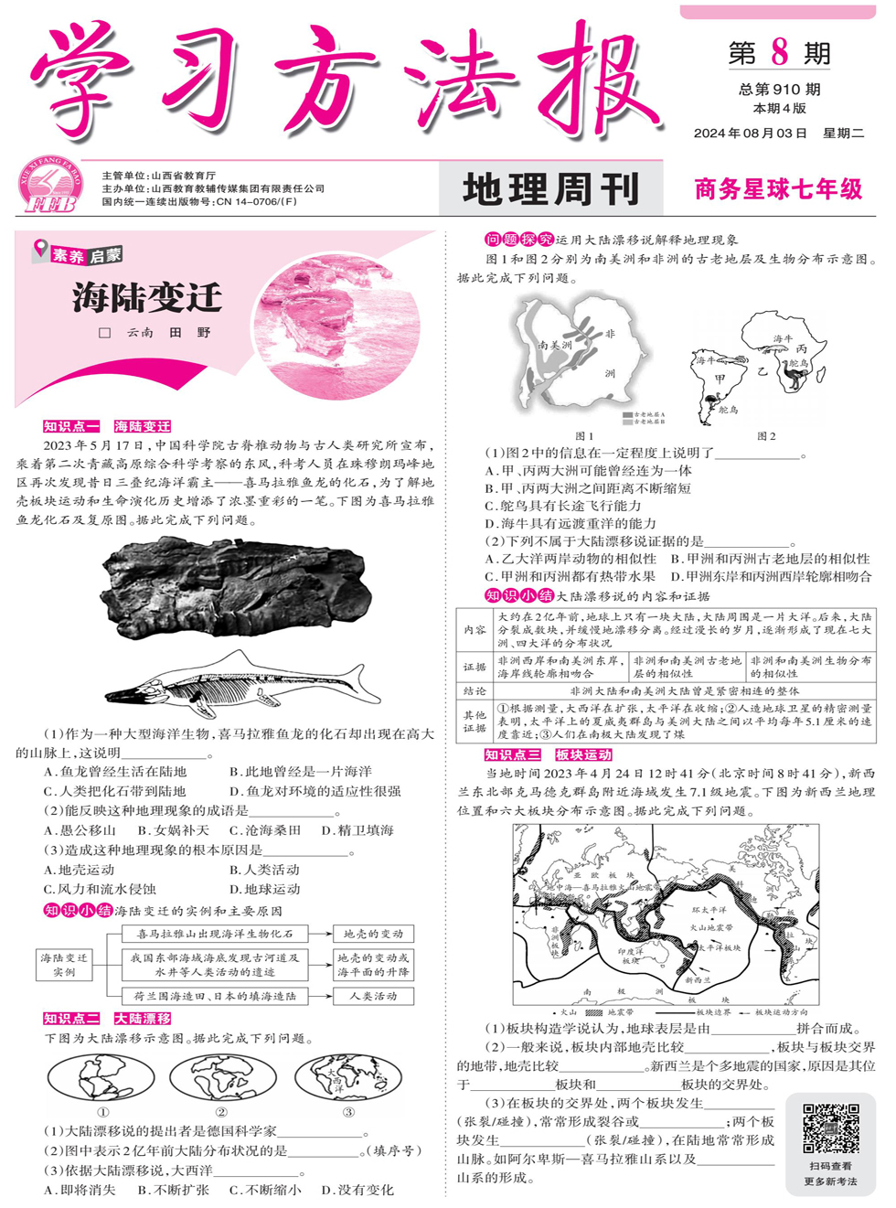 知识点一 海陆变迁 2023年5月17日,中国科学院古脊椎动物与古人类研究所宣布,乘着第二次青藏高原综合科学考察的东风,科考人员在珠穆朗玛峰地区再次发现昔日三叠纪海洋霸主——喜马拉雅鱼龙的化石,为了解地壳板块运动和生命演化历史增添了浓墨重彩的一笔。下图为喜马拉雅鱼龙化石及复原图。据此完成下列问题。 (1)作为一种大型海洋生物,喜马拉雅鱼龙的化石却出现在高大的山脉上,这说明___________