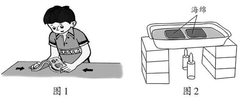 地理实践 学习《海陆的变迁》一节时,同学们做了如下实验。请你参与其中,完成下列问题。 【实验名称】板块运动的形式及产生的现象 【实验过程】 实验一:如图1所示,用手挤压书本。 实验二:如图2所示,利用铝箔盒、海绵、蜡烛、水等材料制作模型,模拟板块运动。 (1)实验一,用手按图1所示箭头方向挤压书本,书本发生的变化是_________,该实验模拟了板块的_________(张裂/碰撞挤压