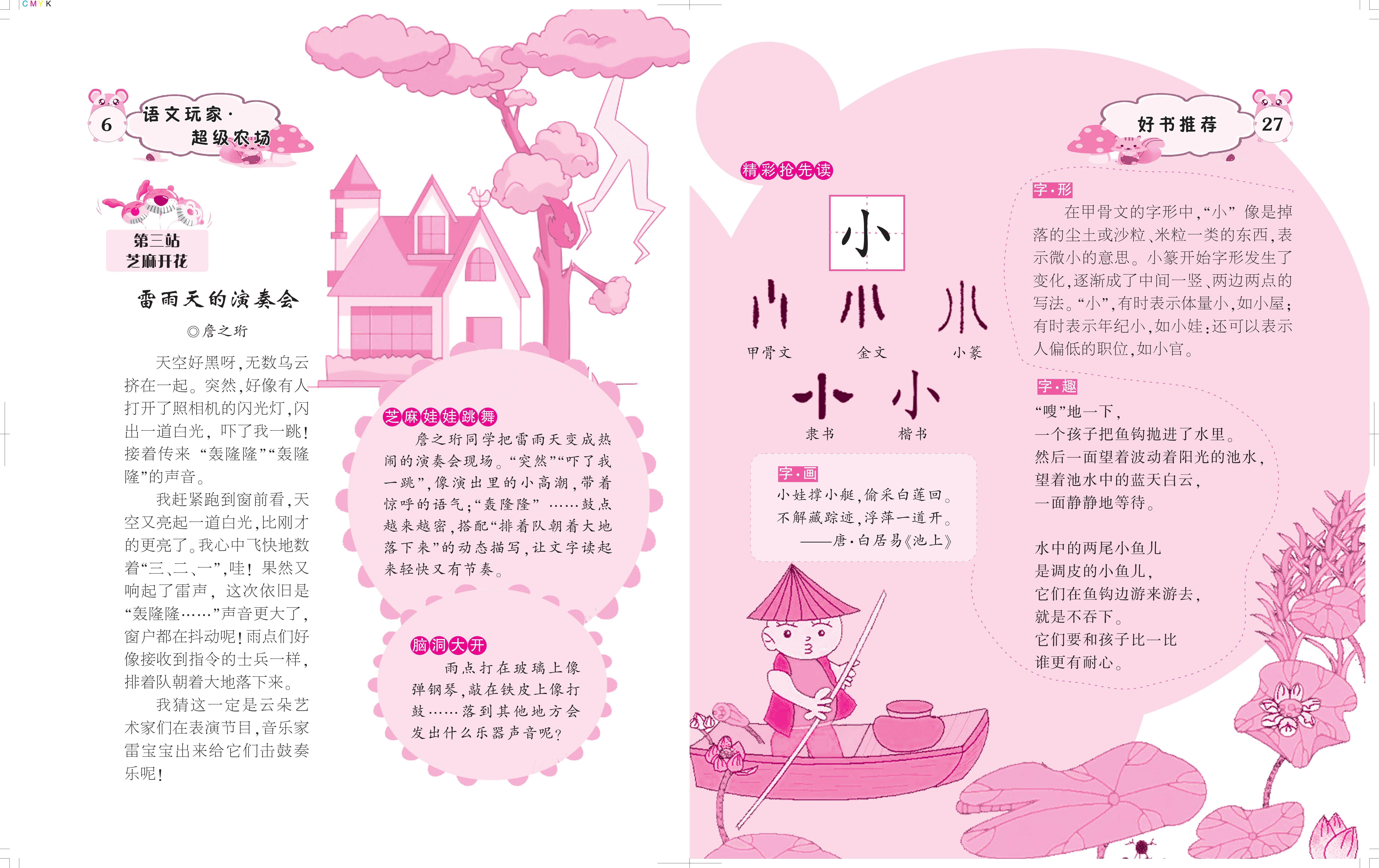 字·画 小娃撑小艇,偷采白莲回。 不解藏踪迹,浮萍一道开。 ——唐·白居易《池上》 字·形 在甲骨文的字形中,“小”像是掉落的尘土或沙粒、米粒一类的东西,表示微小的意思。小篆开始字形发生了变化,逐渐成了中间一竖、两边两点的写法。“小”,有时表示体量小,如小屋;有时表示年纪小,如小娃:还可以表示人偏低的职位,如小官。 字·趣 “嗖”地一下, 一个孩子把鱼钩抛进了水里。 然后一面望着