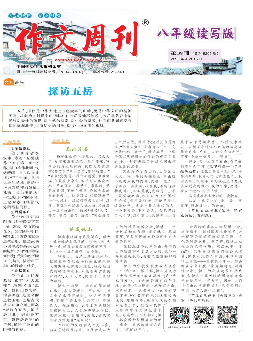 五岳,不仅是中华大地上五座巍峨的山峰,更是中华文明的精神图腾。从秦始皇封禅泰山,到李白“五岳寻仙不辞远”,五岳承载着中华民族对天地的敬畏、对自然的探索、对生命的思考。让我们共同感受五岳的雄浑壮美,聆听历史的回响,探寻中华文明的根脉。 五岳简介 1.东岳泰山 位于山东省泰安市,素有“五岳独尊”“天下第一山”之称。泰山雄伟壮丽,气势磅礴,自古以来被视为帝王封禅、祭祀天地的圣地,也是中华民族精神的
