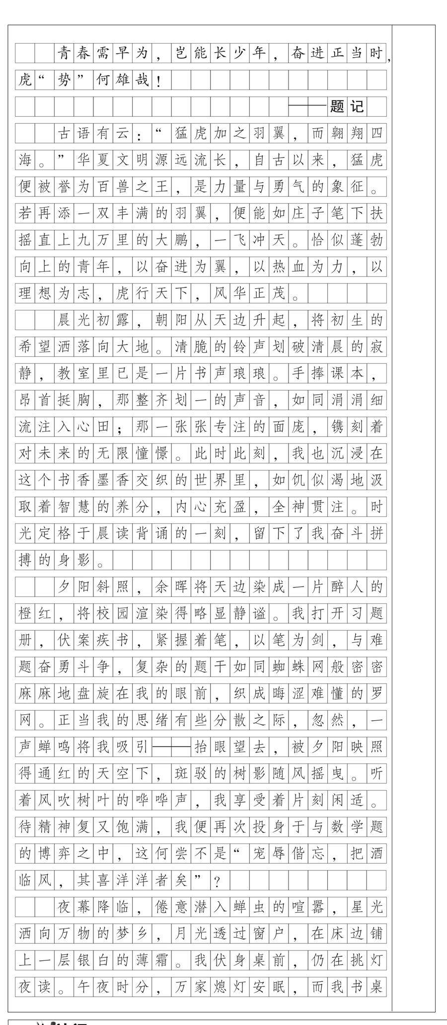 。。青春需早为,岂能长少年,奋进正当时虎“势”何雄哉!。。。。。。。。。。。。。。。。。。。。。。。。。。。题记。。。古语有云:“猛虎加之羽翼,而翱翔四海。”华夏文明源远流长,自古以来,猛虎便被誉为百兽之王,是力量与勇气的象征。若再添一双丰满的羽翼,便能如庄子笔下扶摇直上九万里的大鹏,一飞冲天。恰似蓬勃向上的青年,以奋进为翼,以热血为力,以理想为志,虎行天下,风华正茂。。。。。。。晨光初露,朝阳从
