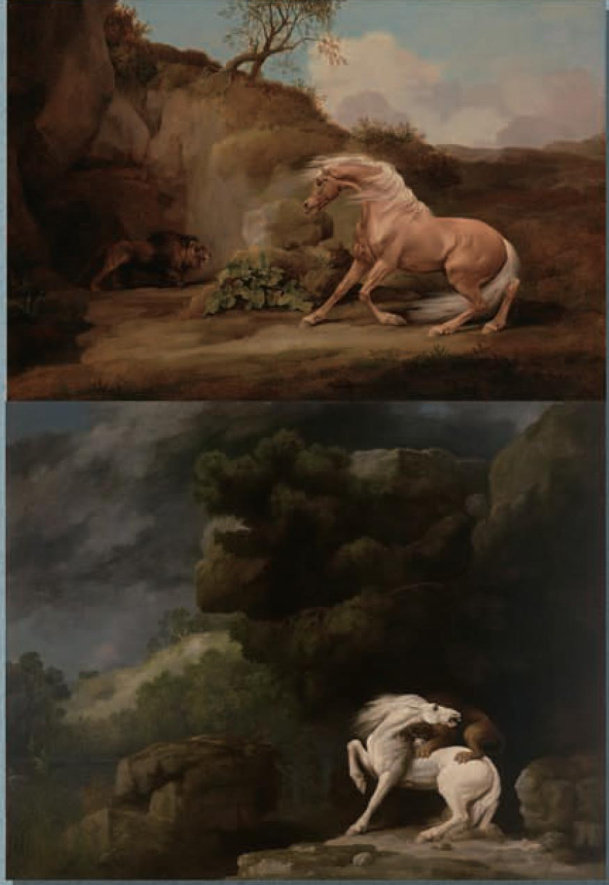热门题材 到了十八世纪,英国画家乔治·斯塔布斯将更多精力投入动物画的创作。他画过许多野生动物,包括斑马、犀牛、驼鹿等等,不过他画马的水平最高,被誉为“史上最伟大的马画家”。 斯塔布斯画过各种各样的马,它们毛皮光滑,身姿矫健,一看就是“宝马”。这些马姿态各异,或奔跑,或吃草,或休憩,无不神采奕奕。其中有匹被称为“响外套”的阿拉伯种马,它通体枣红,两只后蹄上有一白毛,仿佛穿着一双白袜子;它的额头上