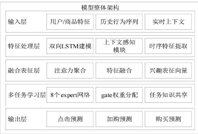 摘要:针对电商用户行为预测中传统模型在实时上下文与多任务学习方面的不足,文章提出融合实时感知与多门专家混合网络(Multi-gate Mixture-of-Experts,MMoE)的优化模型。该模型通过多粒度时间窗口捕捉动态兴趣,利用多专家网络实现任务间特征共享与特异性平衡。实验显示,文章模型在点击、加购和购买任务上的曲线下面积(Area Under Curve,AUC)分别达0.847、0.815和0.789,推理延迟降至 7.5ms ,性能显著优于基线方法。研究表明,该模型有效提升了预测精度与系统效能,为电商用户行为预测提供了实用解决方案。