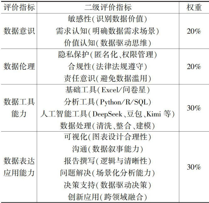摘要:人工智能时代,数据素养成为核心能力,而目前高职学生的数据素养仍有较大提升空间。文章借鉴社会认知理论,构建环境、个人、行为的三维模型,搭建数据素养评价体系,涵盖数据意识、数据伦理、数据工具能力、数据表达应用能力4个一级评价指标,探究数据素养影响因素。文章以电子商务专业学生为例,采用问卷调查法,共回收251份有效问卷,结果表明学生的数据工具能力、数据表达应用能力较弱,个人能力、环境支持、教学实践与数据素养的相关性较高。后续可聚焦改善环境支持、提升教学实践能力,重点提升学生的数据工具能力、数据表达应用能力。基于实证结果,文章构建并实践训 $$ 课 $$ 赛三线的数据素养教育模式,学生数据素养提升显著。 关键词:数据素养;人工智能素养;信息素养;电子商务;教育模式