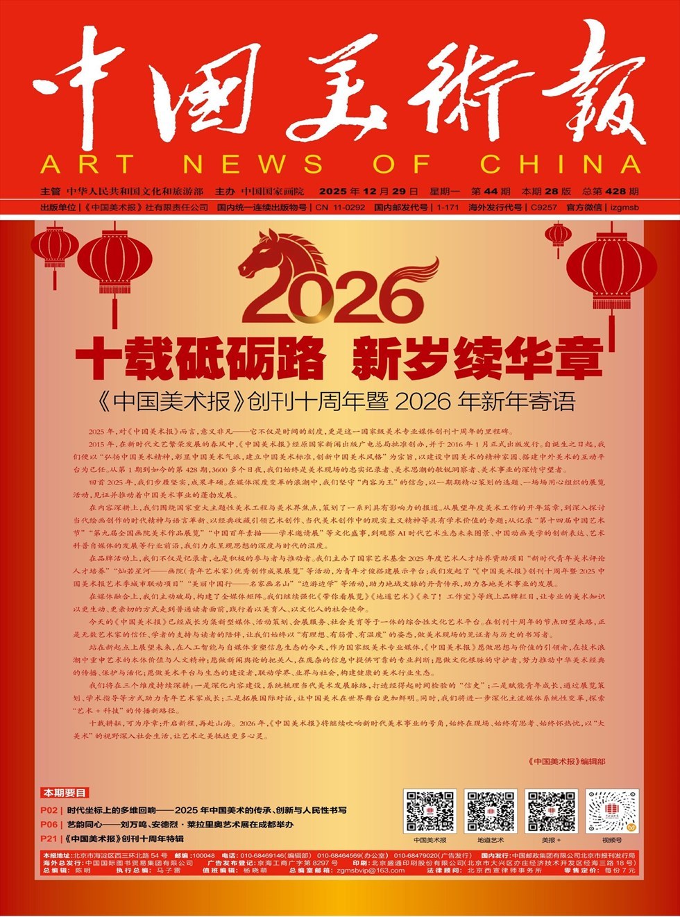 《中国美术报》成立于2015年12月26日,是文化和旅游部主管、中国国家画院主办的国家级美术专业媒体。2015年1月,由国家新闻出版广电总局批准创办,2016年1月正式出版。报纸的国内统一连续出版物号为CN11--0292,国内邮发代号为1-171,海外发行代号为C9257,篇幅为4开20版,彩色胶印周报,逢周一出版。
