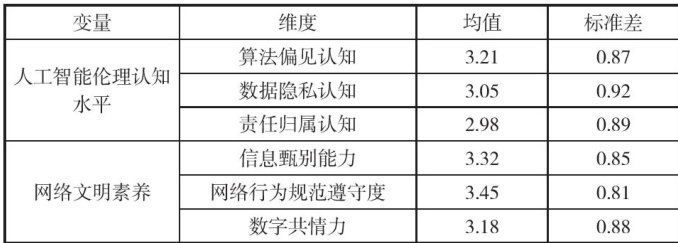 摘要:本文以大学生群体为对象,通过SPSS 实证分析探究人工智能伦理认知水平对网络文明素养的影响,并构建包含算法偏见认知、数据隐私认知和责任归属认知评估体系以及信息甄别能力等维度的衡量框架。研究发现,二者呈显著正相关,其中,数据隐私认知对信息甄别能力的影响最为突出,责任归属认知在网络行为规范遵守度方面作用明显。通过深入探究旨在为提升公众网络文明素养、构建健康网络生态提供参考。