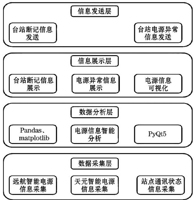 摘要:针对目前地震预警站点出现的供电系统、通信系统2个高故障点,设计了一套集成监控软件,实现不同厂家智能电源的信息集成,数据快速分析,故障快速排查,供电故障事前告警,信息精准推送等功能。软件主要由信息采集、信息分析、信息展示、信息发送4部分组成。信息采集主要用来采集预警站点的电源信息和网络通讯状态;信息分析主要实现异常信息分析提取;信息展示主要用来展示异常信息告警及电源信息可视化;信息发送主要用来向移动端进行异常信息发送。该监控软件弥补了目前预警值班工作面临的困难,减轻预警值班人员值班值守压力,缩短故障响应时间,提升预警值班故障处理的效率,具有较高的实用性。
