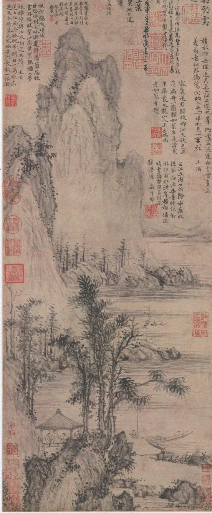 提及送别诗,同学们脑海中会跃入哪些千古绝唱呢?是王维以酒寄情,在不舍与哀婉交织中写就的“劝君更尽一杯酒,西出阳关无故人”,还是高适一扫悲切,以开阔胸襟劝慰友人的“莫愁前路无知己,天下谁人不识君”?文人墨客在送别之际,常借诗歌、绘画以抒心怀,因“缘”与君友,以“礼”与君别,为我们留下了璀璨的文化瑰宝。 读画 《凤城饯咏图》由明初画家王绂所绘。画中山石、草亭、小船等元素巧妙融于山水之间。左下方