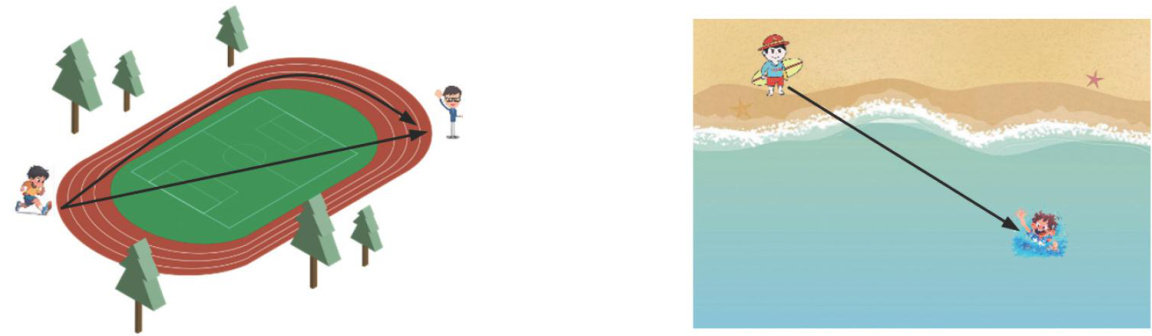 你的“选择” 当你在操场活动时,发现远处的老师正在向你挥手示意,你会选择什么样的路线跑向这位老师呢?是向着老师的方向笔直地跑过去,还是沿着跑道跑过去呢? 当岸上的救生员发现溺水者时,他会选择什么样的路线施救呢?是径直冲向溺水者,然后跳入水中,再以同样的方向朝着溺水者游去,还是另有更快捷的路线呢? 操场上的你一定会选择径直跑向老师,因为“两点之间,线段最短”,这会比沿跑道绕行更节省时间。那