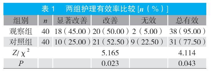 摘要:目的 探讨止咳贴穴位贴敷联合鼓励式护理对小儿肺炎的影响。方法 选取2024年1~12月医院收治的80例小儿肺炎患儿为研究对象,按照随机数字表法分为观察组和对照组各40例。对照组实施常规护理联合鼓励式护理,观察组在对照组基础上加用止咳贴穴位贴敷,比较两组护理效果、主要症状缓解时间、炎症指标(C反应蛋白、白细胞计数)及不良反应发生情况。结果 观察组护理总有效率高于对照组(P<0.05);观察组发