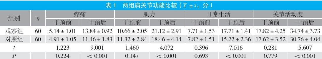 摘要:目的 探讨中医适宜技术护理在围绝经期肩周炎疼痛患者中的应用效果。方法 选取2021年7月至2024年7月医院收治的120例围绝经期肩周炎疼痛患者为研究对象,按照随机数字表法分为对照组与观察组各60例。对照组予以常规护理,观察组予以中医适宜技术护理,比较两组肩关节功能、炎性介质水平及生活质量。结果 干预后,观察组肩关节功能各维度评分均高于对照组(P<0.05);干预后,观察组肿瘤坏死因子-α(