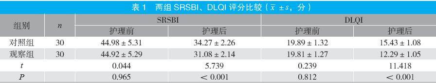 摘要:目的 探讨感恩情绪干预对银屑病患者体象障碍及希望水平的影响。方法 选取2024年4月至2025年3月医院收治的60例银屑病患者为研究对象,按照随机数字表法分为对照组与观察组各30例。对照组接受常规护理,观察组接受感恩情绪干预护理,两组均持续护理1个月,比较两组体象障碍[体象障碍自评量表(SRSBI)评分]、希望水平[Herth希望量表(HHI)评分]及生活质量[皮肤病生活质量指数(DLQI)