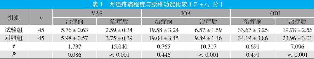 摘要:目的 探讨腰背部肌肉拉伸练习联合温灸、刮痧疗法治疗腰椎间盘突出症(LDH)的临床效果。方法 选取2023年1月至2024年12月医院收治的90例LDH患者为研究对象,按照随机数字表法分为试验组与对照组各45例。对照组接受常规治疗与背部肌肉拉伸练习,试验组在对照组基础上联合温灸、刮痧疗法治疗,比较两组疼痛程度、腰椎功能[日本骨科学会评分法(JOA)评分、Oswestry功能障碍指数(ODI)]
