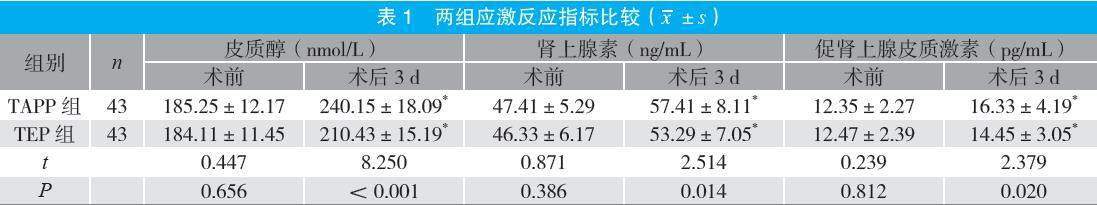 摘要:目的 探讨老年腹股沟疝患者采用不同术式的临床疗效。方法 选取2022年9月至2024年12月医院收治的86例老年腹股沟疝患者为研究对象,按手术术式不同分为腹腔镜完全腹膜外疝修补术(TEP)组与腹腔镜经腹腹膜前修补术(TAPP)组各43例,比较两组应激反应指标、术后疼痛程度[视觉模拟评分法(VAS)评分]及术后并发症发生情况。结果 TEP组术后VAS疼痛评分低于TAPP组(P<0.05);术后