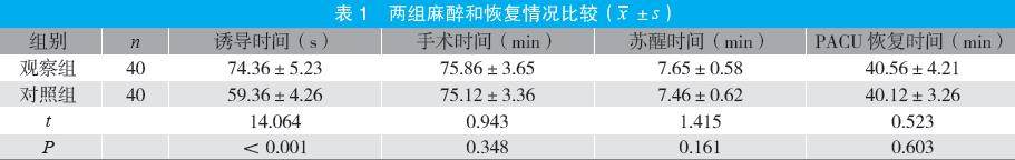 摘要:目的 探讨环泊酚对中老年腹腔镜手术患者血流动力学及认知功能的影响。方法 选取2024年11月至2025年4月医院收治的80例中老年腹腔镜手术患者为研究对象,按随机数字表法分为观察组与对照组各40例。对照组予以丙泊酚,观察组予以环泊酚,比较两组麻醉和恢复情况、血流动力学指标[平均动脉压(MAP)、心率(HR)水平]、认知功能[简易精神状态检查量表(MMSE)评分]、术后苏醒质量[恢复质量15项