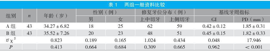 摘要:目的 探讨瓷贴面修复中牙体预备量对牙周组织健康的短期影响。方法 选取2023年6月至2024年12月医院收治的86例行瓷贴面修复患者为研究对象,按照随机数字表法分为A组与B组各43例。A组采用最小预备量(0.3~0.5 mm),B组采用常规预备量(0.5~0.8 mm),比较两组牙龈指数(GI)、牙周探诊深度(PD)、龈沟出血指数(SBI)、菌斑指数(PLI)及修复体边缘适合性。结果 修复后