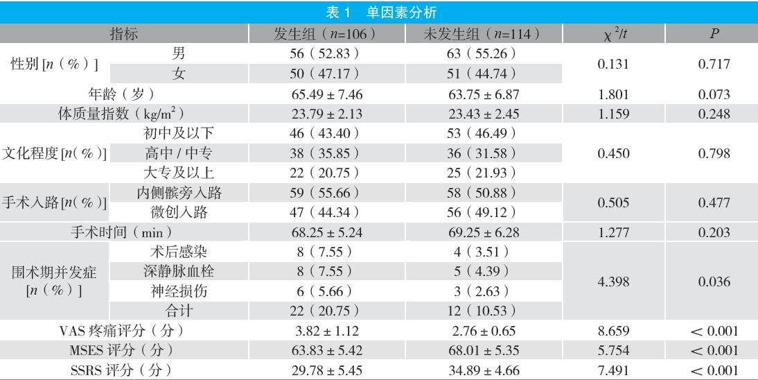 摘要:目的 分析膝关节骨性关节炎(KOA)患者全膝关节置换术(TKA)后运动恐惧发生情况与相关因素。方法 选取2022年12月至2024年12月在医院行TKA的220例KOA患者为研究对象,根据Tampa运动恐惧量表(TSK)评分结果分为发生组(TSK得分>37分,出现运动恐惧)106例与未发生组(TSK得分≤37分,未出现运动恐惧)114例。通过单因素与多因素Logistic回归分析KOA患者T