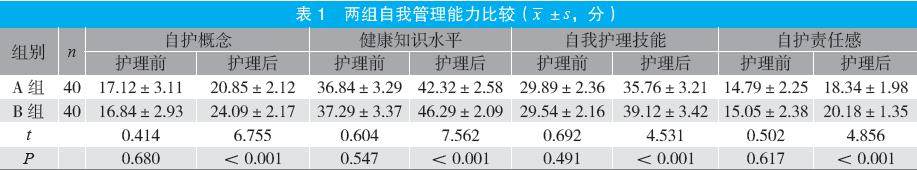 摘要:目的 探讨以自我管理能力提升为导向的护理模式在老年支气管哮喘患者中的应用效果。方法 选取2021年12月至2024年12月医院收治的80例老年支气管哮喘患者为研究对象,按随机数字表法分为A组(40例,常规护理模式)和B组(40例,以自我管理能力提升为导向的护理模式),比较两组自我管理能力、遵医行为及肺功能。结果 护理1个月后,B组自护概念、健康知识、自我护理技能、自护责任感评分均高于A组,遵