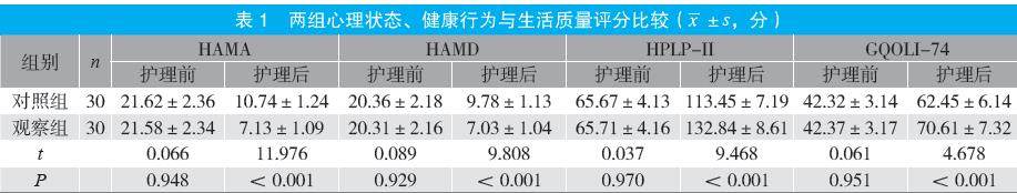 摘要:目的 探讨基于健康信念模式(HBM)的护理干预应用于消化道出血内镜治疗患者的临床效果。方法 选取2023年3月至2025年3月于医院行内镜治疗的60例消化道出血患者为研究对象,按随机数字表法分为对照组和观察组各30例。对照组采取常规护理干预,观察组采取基于HBM的护理干预,均持续干预至出院,比较两组心理状态[汉密尔顿焦虑量表(HAMA)、汉密尔顿抑郁量表(HAMD)评分]、健康行为[健康促进
