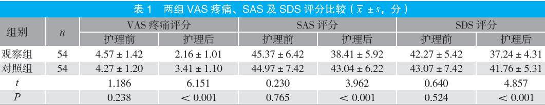 摘要:目的 探讨中医情志护理在肝气郁结型胁痛患者中的应用效果。方法 选取2023年1月至2024年1月医院收治的108例肝气郁结型胁痛患者为研究对象,随机划分为对照组和观察组各54例。对照组应用常规护理,观察组应用中医情志护理,比较两组疼痛程度[视觉模拟评分法(VAS)评分]、不良情绪[焦虑自评量表(SAS)评分、抑郁自评量表(SDS)评分]、生活质量[健康调查简表(SF-36)评分]及中医证候积