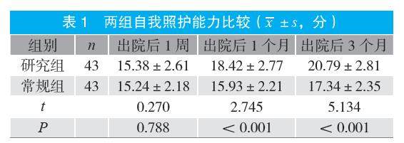 摘要:目的 探讨微信平台延续性干预对肠造口患者术后自我照护和心理适应能力的影响。方法 选取2023年1月至2024年6月医院收治的86例肠造口患者为研究对象,按照随机数字表法分为常规组与研究组各43例。常规组给予常规干预,研究组给予微信平台延续性干预,比较两组自我照护能力(肠造口自我护理知识问卷评分)与心理适应能力[造口患者适应量表(OAI-23)评分]。结果 出院后1周,两组自我照护能力比较,差