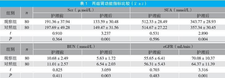 摘要:目的 探讨信息-动机-行为技巧(IMB)模型护理干预对慢性肾衰竭(CRF)血液透析患者肾功能与并发症的影响。方法 选取2024年1月至2025年3月医院收治的160例CRF血液透析患者为研究对象,随机分为观察组与对照组各80例。观察组给予IMB模型护理干预,对照组给予常规护理干预,比较两组肾功能[血肌酐(Scr)、血尿酸(SUA)、血尿素氮(BUN)及肾小球滤过率(eGFR)水平]、自护能力