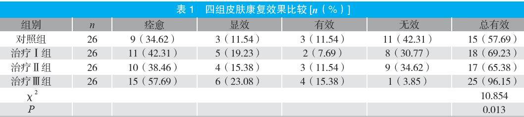 摘要:目的 探讨臭氧水疗联合中药熏洗护理对手部慢性湿疹(CHE)患者皮肤康复效果的影响。方法 选取2023年10月至2024年10月医院收治的104例CHE患者为研究对象,按随机数字表法分为对照组、 治疗Ⅰ组、治疗Ⅱ组及治疗Ⅲ组各26例。对照组给予西药口服+外用药膏+常规护理干预,治疗Ⅰ组给予中药熏洗+西药口服+外用药膏+常规护理干预,治疗Ⅱ组给予臭氧水疗+西药口服+外用药膏+常规护理干预,治疗