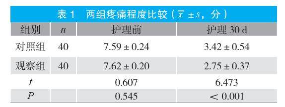 摘要:目的 探讨穴位按摩结合中药贴敷在带状疱疹后遗神经痛患者中的应用。方法 选取2024年1月至2024年12月医院收治的80例带状疱疹后遗神经痛患者为研究对象,按护理方案差异分为对照组(实施中药贴敷)和观察组(实施穴位按摩结合中药贴敷)各40例。比较两组疼痛程度、生活质量评分、负性情绪评分、睡眠质量评分及护理满意度。结果 护理30 d时,观察组疼痛程度评分、负性情绪评分及睡眠质量评分均低于对照组