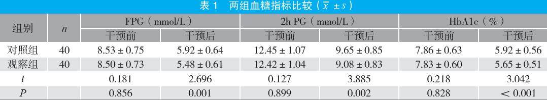 摘要:目的 探讨分级运动方案护理干预在糖尿病青年患者中的应用效果。方法 选取2023年10月至2025年5月医院收治的80例糖尿病青年患者为研究对象,按照随机数字表法分为对照组和观察组各40例。对照组给予常规护理干预,观察组在此基础上实施分级运动方案护理干预,比较两组血糖指标、体力耐力、生活质量及护理满意度。结果 干预后,观察组空腹血糖(FPG)、餐后2小时血糖(2h PG)、糖化血红蛋白(HbA