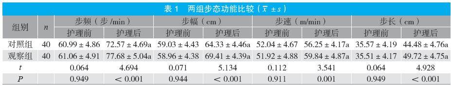 摘要:目的 探讨基于跌倒风险评估量表的系统化康复护理对帕金森病患者的影响。方法 回顾性选取2022年1月至2024年12月医院收治的80例帕金森病患者为研究对象,根据时间先后顺序分为对照组与观察组各40例。对照组(2022年1月至2023年6月)接受常规护理,观察组(2023年7月至2024年12月)接受基于跌倒风险评估量表的系统化康复护理,比较两组步态功能(步频、步幅、步速、步长),运动功能[统