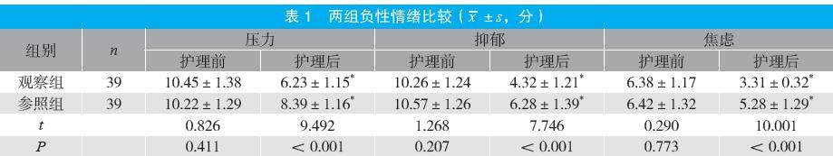 摘要:目的 探讨正念减压疗法对心脏术后患者焦虑管理的影响。方法 选取2023年10月至2024年10月医院收治的78例接受冠心病经皮冠状动脉介入术后患者为研究对象,随机分为参照组与观察组各39例。参照组采用常规护理,观察组采用正念减压疗法护理,比较两组负性情绪、正念觉知水平、日常生活能力及护理满意度。结果 护理后,观察组抑郁、焦虑、压力评分均低于参照组(P<0.05);护理后,观察组正念觉知各项水