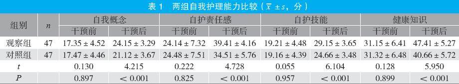 摘要:目的 探讨基于5A护理模式的自我管理方案在癌症经外周中心静脉置管(PICC)带管出院居家患者中的应用效果。方法 选取2023年3月至2025年3月医院收治的94例癌症PICC带管出院居家患者为研究对象,按随机数字表法分为对照组与观察组各47例。对照组予以常规护理,观察组予以基于5A护理模式的自我管理方案,比较两组自我护理能力[自我护理能力量表(ESCA)评分]、并发症发生情况、心理状态[焦虑