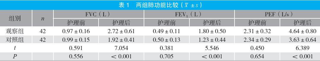 摘要:目的 分析基于赋能理论的肺康复护理在慢性阻塞性肺疾病患者中的应用效果。方法 选取2024年3月至2025年3月医院收治的84例慢性阻塞性肺疾病患者为研究对象,随机分为对照组和观察组各42例。对照组采用常规护理,观察组采用基于赋能理论的肺康复护理,比较两组肺功能[用力肺活量(FVC)、第1秒用力呼气容积(FEV1)及呼气流量峰值(PEF)]、呼吸困难程度[改良呼吸困难指数(mMRC)]、自我效