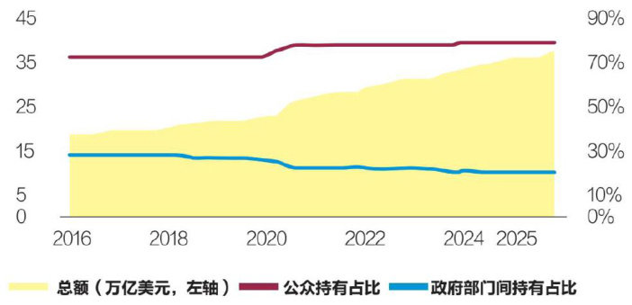2015年至2025年,美债的海外需求不断演变,外国持有美债占比整体呈下降趋势。在美债规模屡创新高的背景下,美债外国持有者结构变化将对美国政府债务可持续性、国债市场流动性及美元在国际货币体系中的地位等方面带来深远影响。 长期以来,美国国债被视为全球最安全、最具流动性的资产之一,美国国债的收益率也是全球金融资产定价锚。2015一2025年美国国债的海外需求不断演变,外国持有美国国债占比整体呈下降趋