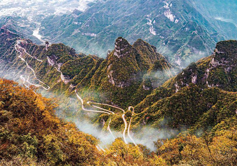 秋天的张家界。 恩施大峡谷的峰林。 恩施大峡谷的绝壁栈道。 梵净山。这三处景观共同展现了武陵走廊自然风光的奇绝与壮丽。 从巍峨的武陵山脉到蜿蜒的江河溪流,从古老的巴盐古道到现代的交通枢纽,从多元的民族文化到交融的民俗风情,武陵走廊犹如一部厚重的史诗,记录着自然造化的神奇,镌刻着历史变迁的痕迹,描绘着文化共生的画卷。 在中国腹地,湘、鄂、黔、渝四省市交界处,伸展着一片神奇的土地——武陵走廊