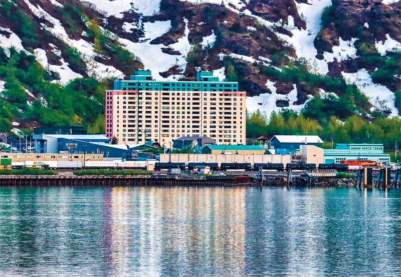 安克雷奇是阿拉斯加最大的城市,惠蒂尔小镇则位于其东南方向,车程约1小时。这是一座偏远小镇,它之所以声名远播,是因为这里的居民几乎全都生活在一栋名为贝吉奇塔(Begich Towers)的大楼里。 北纬61度 一栋楼即一座城 贝吉奇塔建于1956年,楼高14层,最初作为美军及家属的宿舍使用,如今已成为镇上约270位居民共同的家园。整栋大楼几乎囊括了小镇运转所需的一切设施:一楼有家名为
