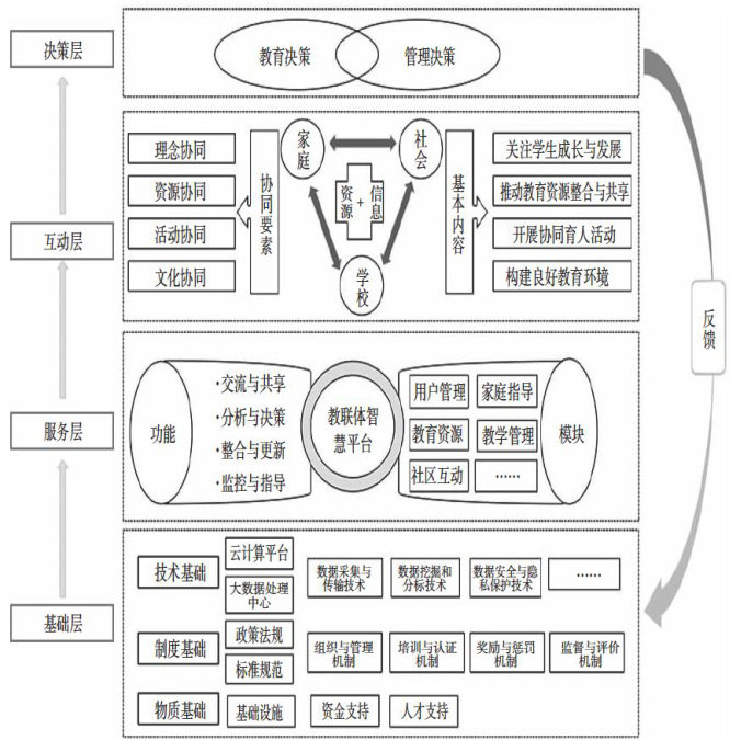 要数智赋能教联体建设是基础教育高质量发展的重要驱动。其内在逻辑体现为:观念逻辑层面,秉持全人发展教育观、多元共育合作观、数智驱动发展观,强调以学习者为中心、构建协同育人生态、实现技术与教育规律统一;运行逻辑层面,形成“基础层—服务层—互动层—决策层”闭环机制,依托智慧平台支撑个性化服务与资源协同,并通过决策反馈持续优化系统。然而,在推进数智赋能教联体建设过程中,仍面临制度供给滞后与内容泛化、技