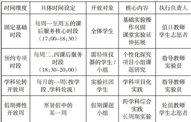 摘要为提升初中生实践创新能力,借鉴开放实验室在高校人才培养中相对成熟的体系,有必要探索开放实验室在初中场域中的运用路径。针对中学开放实验室存在的管理机制梗阻、专业支撑薄弱、活动设计固化等问题,提出建规范激活力、强能力聚资源、创项目拓空间三大策略:通过固定与弹性结合的时段设计、三位一体运维团队构建等规范管理;依托问题导向备课、跨学科教师共同体及网络互动平台强化专业支撑;借助三阶项目库、技术工程实践及无界实验场拓展创新空间,以期为中学开放实验室提质及初中生实践创新能力培养提供实践参考。
