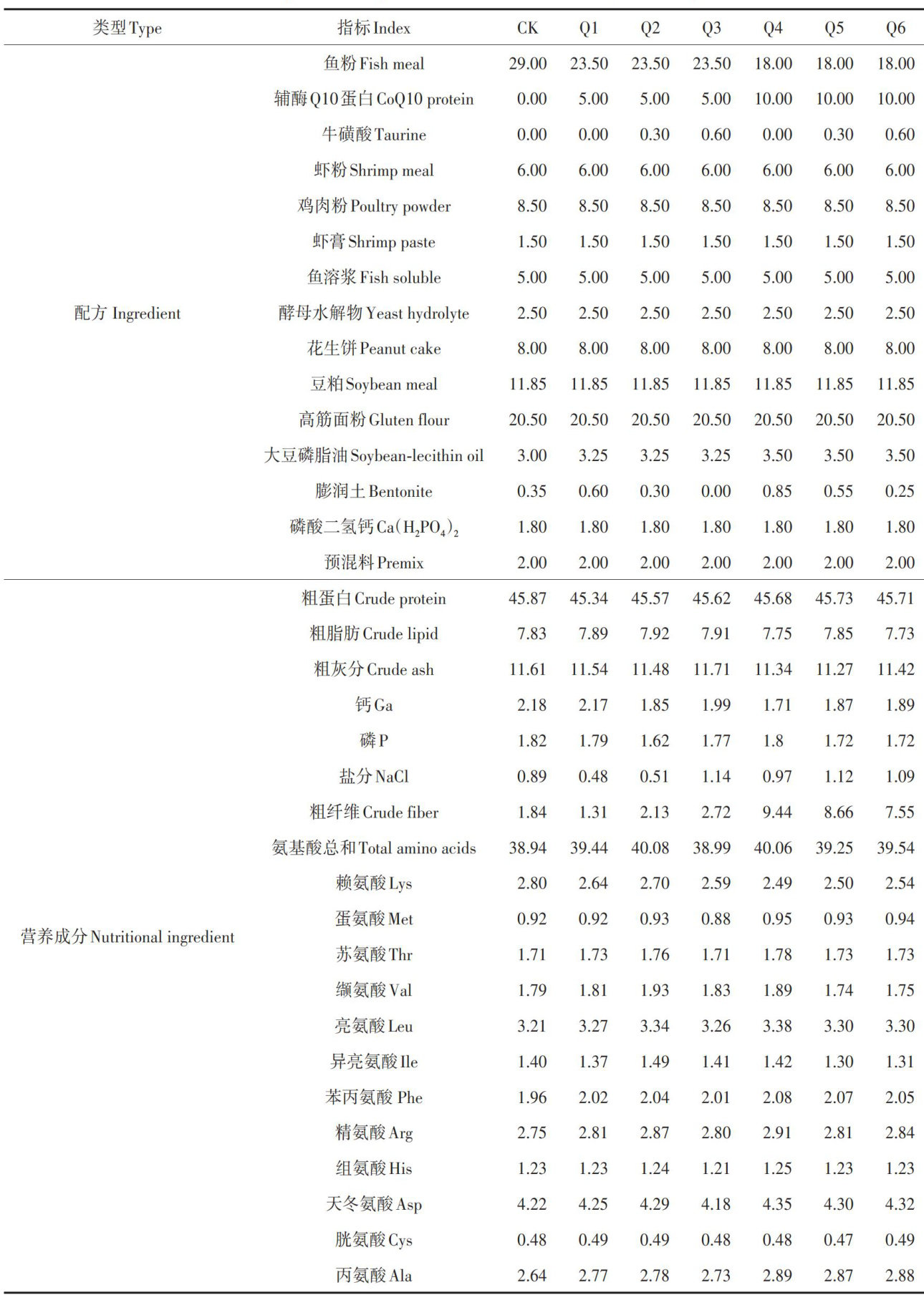 摘要:为探讨在凡纳滨对虾(Litopenaeus vannamei)饲料中添加辅酶Q10蛋白替代鱼粉并补充牛磺酸对其生长及抗应激能力的影响,开展为期56d的养殖试验。以鱼粉饲料为对照(CK),分别设置 5% 辅酶Q10蛋白(Q1) .5% 辅酶Q10蛋白 +0.3% 牛磺酸(Q2) ,5% 辅酶Q10蛋白 +0.6% 牛磺酸(Q3) 10% 辅酶Q10蛋白(Q4)10% 辅酶Q10蛋白 +0.3% 牛磺酸(Q5)及 10% 辅酶Q10蛋白 +0.6% 牛磺酸(Q6),共计7个处理。结果表明,Q3处理特定生长率高于其他处理,且饵料系数显著低于其他处理;辅酶Q10蛋白处理运输应激后的成活率均高于CK,但处理之间差异不显著;运输应激后,添加牛磺酸处理血浆的超氧化物歧化酶活性、总抗氧化能力高于CK,而丙二醛含量低于CK,但差异不显著。综上所述,在该研究条件下,在饲料中添加 5% 辅酶Q10蛋白和 0.6% 牛磺酸替代鱼粉,可以提高凡纳滨对虾的生长性能及抗应激能力。研究结果揭示了辅酶Q10蛋白和牛磺酸在提高对虾养殖效益和可持续发展中的潜力,为凡纳滨对虾低鱼粉饲料的开发提供了科学依据。