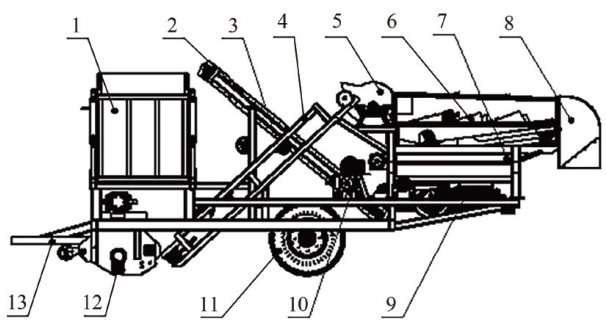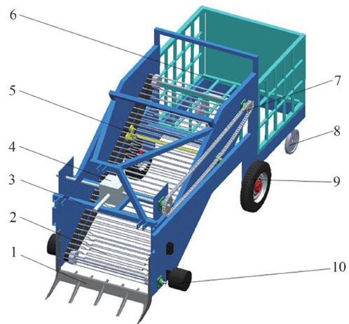 摘要:油莎豆块茎生长在地下,颗粒较小,豆与土分离困难,东北地区多为黑黏土质,在初筛时易导致土沉积在筛孔上产生堵塞现象,影响油莎豆收获机的脱粒效率和脱粒质量。针对东北地区油莎豆收获时设备易堵塞及脱净率低的问题,研制了一款复合筛分式油莎豆收获机。对装置的关键部件输送链条装置和滚筒脱粒装置进行优化设计。采用Box-Behnken方法对输送链条装置进行优化,探究不同因素对脱净率及漏豆率的影响。结果表明,网链最优工作参数组合为起振高度 20mm 网链线速度 0.9m?s-1 网链角度 46° ;在此条件下,脱净率和漏豆率分别为 66.83% 和 0.55% 。对滚筒脱粒装置的齿形进行试验表明,当齿形为弓齿钉齿混合时效果良好,脱净率和破损率分别为 99.33% 和 1.10% ,并使用Ansys软件进行了模态分析,表明该装置的安全性良好。研究结果为油莎豆收获机设计提供参考,可促进油莎豆种植向着产业化发展。