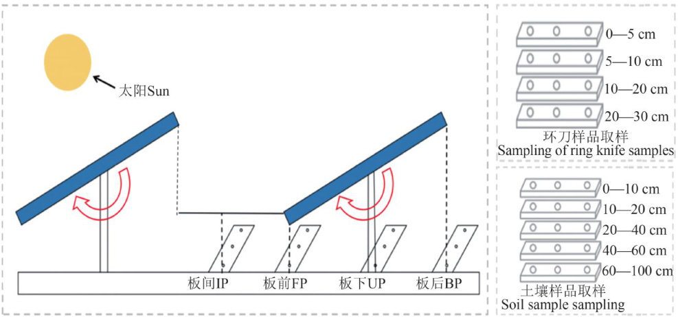 摘要:为明确沙区光伏电站平单轴低桩追踪式光伏电板对土壤养分空间分布特征的影响,以内蒙古西部典型沙区光伏电站植被自然恢复区内平单轴低桩追踪式光伏电板下的土壤为研究对象,将光伏电板分为光伏板间(IP)、板前(FP)、板后(BP)、板下(UP)4个位置,同时在每个位置设置0—10、10—20、20—40、40—60、60—100cm 共5种土层深度,以光伏电站内无任何光伏措施的裸沙地为对照(CK),通过相关分析及单因素方差分析探究平单轴低桩追踪式光伏电板下土壤的养分水平以及垂直分布特征,进一步利用主成分分析对该场区不同位置的土壤质量进行评价。结果表明,追踪式光伏电板的建设会降低光伏场区的大气温度与大气湿度。电板不同位置的土壤水分和土壤容重均表现出随土层深度的增加而增加的规律。追踪式光伏电板的建设会增加土壤的养分含量,土壤碱解氮、有机质、速效钾含量随土层深度的增加而降低,速效磷含量在不同深度之间变化不大且呈现波动性变化。追踪式光伏电板区域的土壤质量较CK位置有所提高,其中IP、FP、RP位置的土壤质量较好,UP与CK位置的土壤质量较差,表明沙区追踪式光伏电板的建设与运营会提高场区内的土壤质量。研究结果为沙区光伏电站的生态修复提供理论支持。